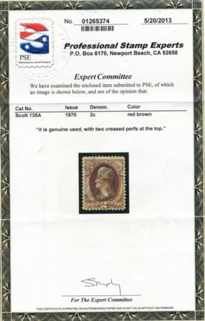 Scott 135A, F-VF Lt. Cancel, PSE Cert, 2 creased perfs at top, 1870 2c red brown, with I Grill CV $350.00