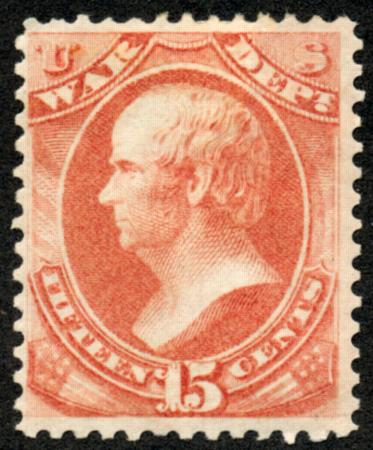 Scott O90, F-VF H, cpl shorter perfs at top, otherwise nice OG example, 1873 15c War Dept. CV $85.00
