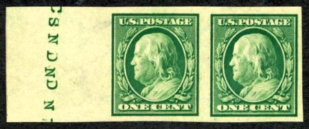 | Scott 343, VF-XF NH, Margin Pair w/lettering, 1908 1c Green, Imperforate, DL wtmk |
