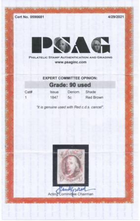 Scott 1, XF, Red CDS Cancel, with PSAG Cert, Grade 90, 1847 5c Red Brown CV $SSV 825 as XF