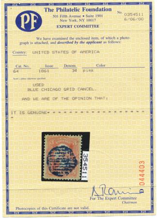 Scott 64, VF+, Blue Chicago Grid Cancel, PF Cert. 1861 3c Pink CV $500.00