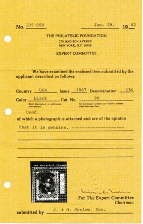 Scott 98, Outstanding AF Centering, with clean PF Certificate! 1867 15c Lincoln, F Grill CV $300 as VF only