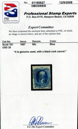 Scott 101, F-VF, PSE Cert., a Scarce Sound stamp with F Grill, 1867 90c Blue, with Black Cork Cancel CV $2700.00
