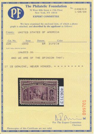 Scott 235, F-VF NH, PF Cert., 1893 6c Columbian CV $150.00