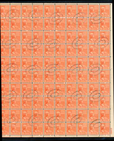 | Scott 811, VF, used, full sheet with light cancels, a few minor perf seps, 1938 6c orange, John Quincy Adams