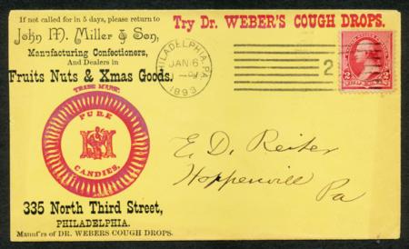 | CONFECTIONS / 1893 Ad noting Weber's Cough Drops, Fruits, Nuts, Xmas Goods, "PURE CANDIES", Slightly reduced at left, Some toning at right and bottom |