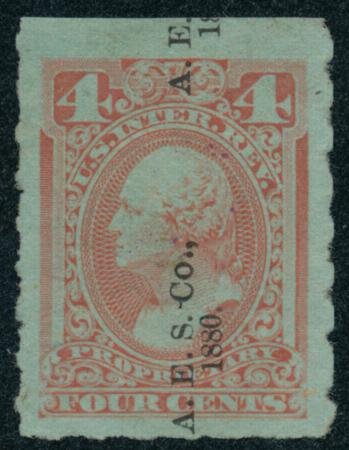 | Scott RB15c, VF, natural straight edge @ top, faint corner crease, 1875 4c red with Printed Cancel |